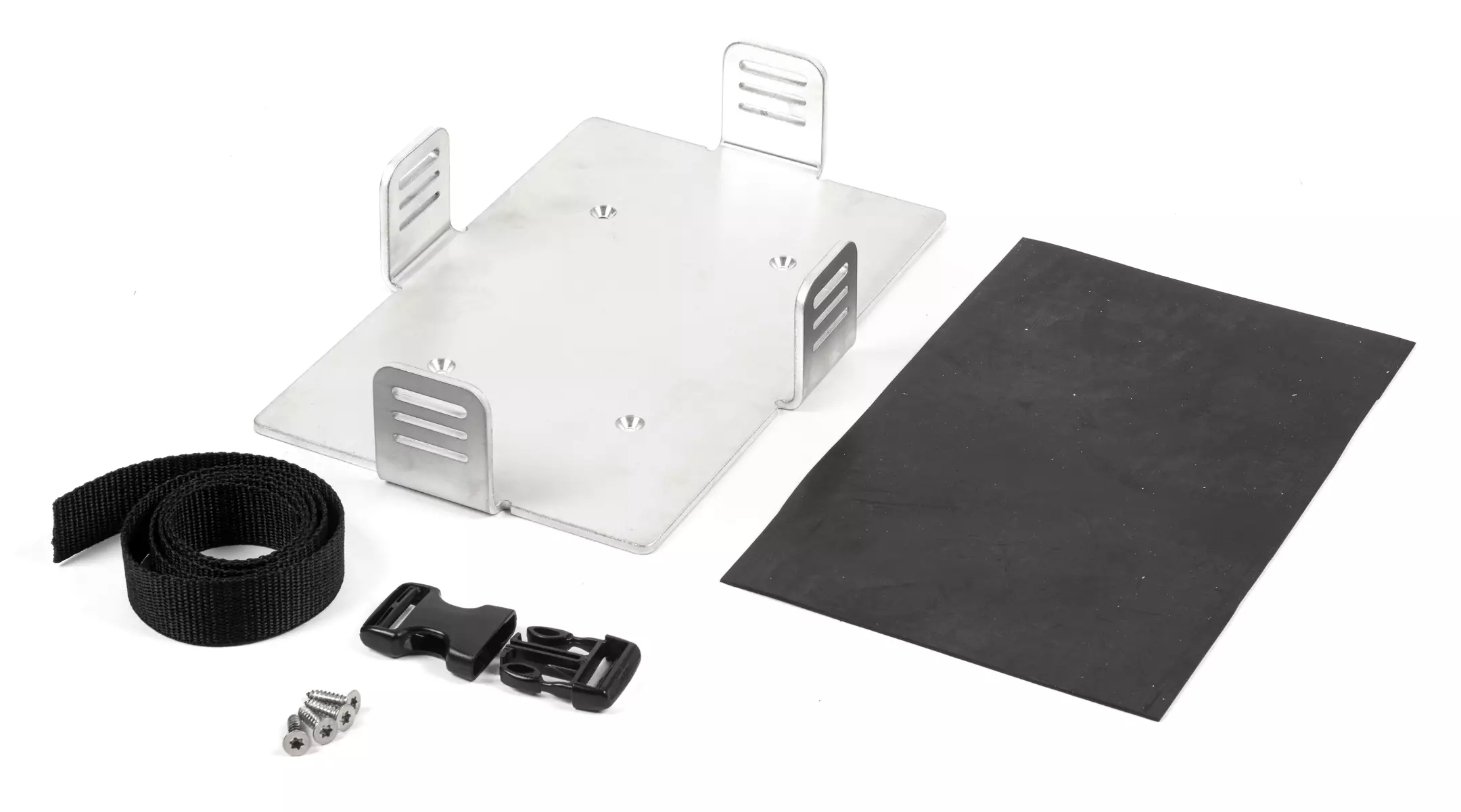 Catchy Aluminium Batteribase med Stropper - er en solid, kompakt og praktisk monteringsløsning for alle batterityper. Festestroppen kan monteres enten på tvers eller på langs, og takket være hurtigspennen er det enkelt å fjerne batteriet.