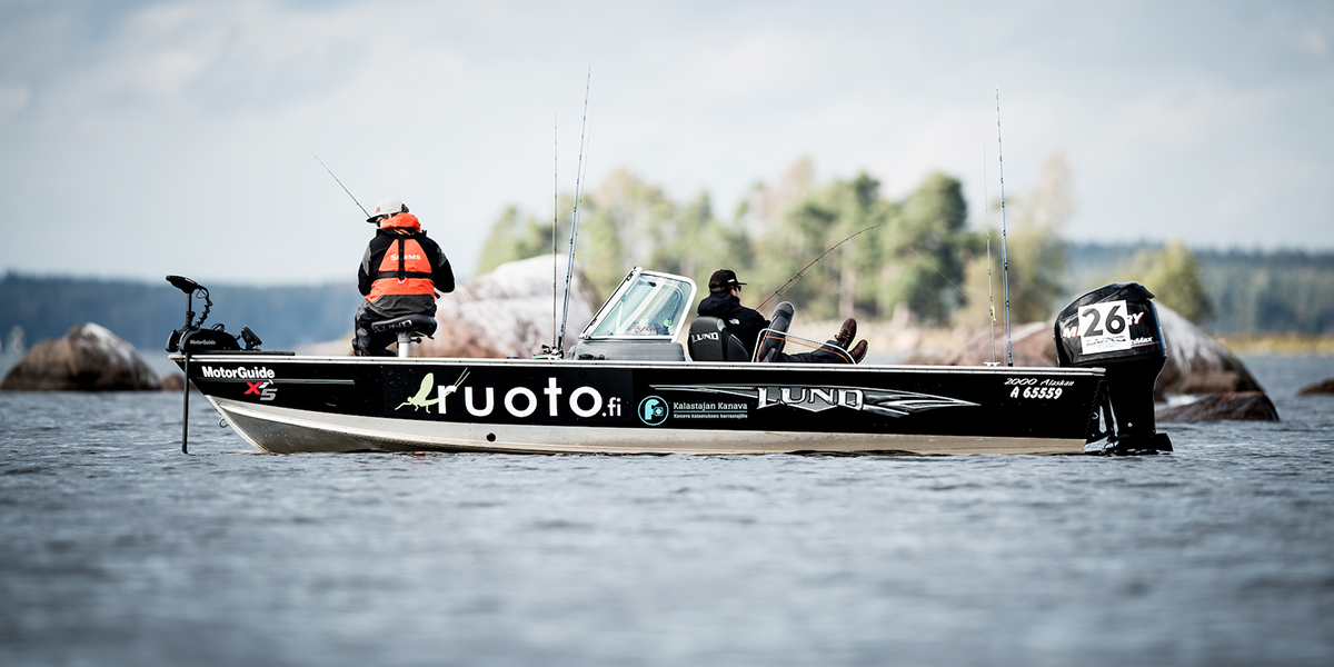 Bildet viser Ruotos team under PredatorMasters fiskeserie 2022. Båten er en Lund 2075 Pro-V, årsmodell 2015, som fortsatt brukes aktivt av Ruotos ansatte.