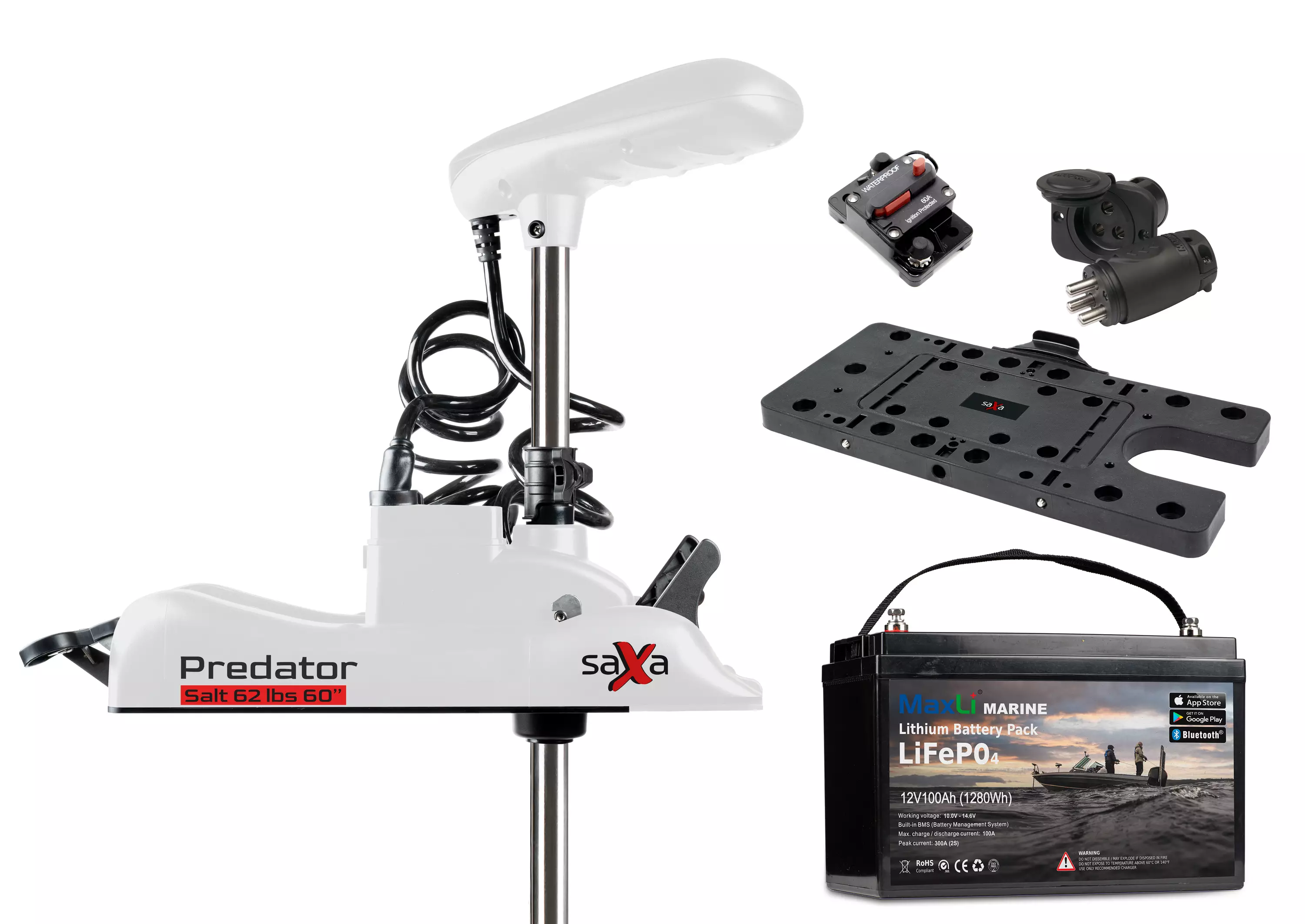 Saxa Predator Salt 62lbs 60'' + MaxLi Lithium er en perfekt pakke med en baugmontert elektrisk motor designet for bruk i saltvann. Denne pakken inkluderer den kraftige Saxa Predator Salt baugmonterte elektriske motoren, det lette og holdbare MaxLi Marine litiumbatteriet, Saxa Predator Quick Release Bracket hurtigfeste, en 60A vanntett automatisk sikring og en Marinco høykvalitets strømkontakt.