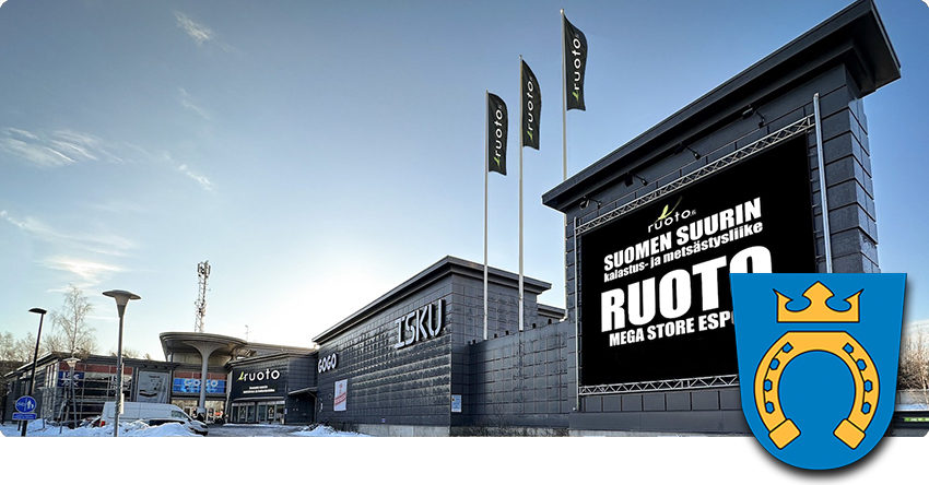 Ruoto Mega Store Esbo er vårt nyeste butikkprosjekt, som åpnet dørene i mai 2023. Vår flotte, nye butikk i Esbo representerer spydspissen blant Ruoto-butikkene og inneholder hele vårt velkjente sortiment. Den rundt tusen kvadratmeter store helheten betjener kundene på en utmerket beliggenhet i Finno 7 dager i uken.