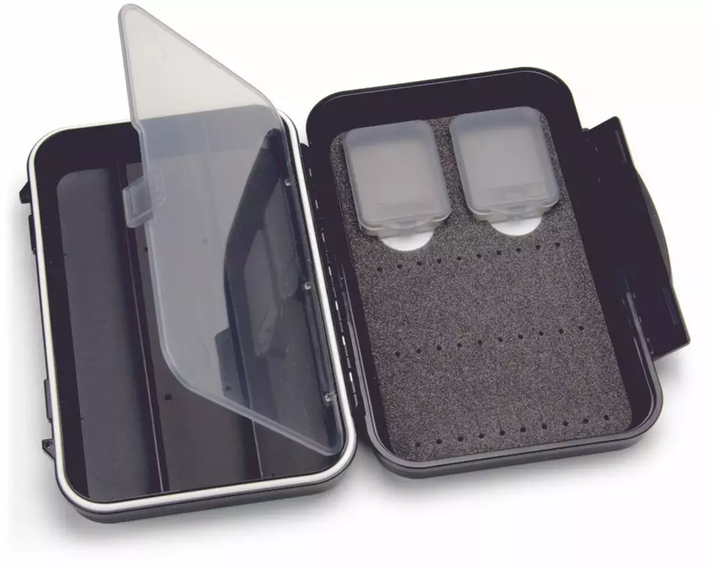 - En praktisk kombinasjon av tre lengre rom og Micro Slit Foam (20 spor) som passer for mellomstore og store fluer. I tillegg små faste rom i lokket for oppbevaring av kroker eller krokholderrør