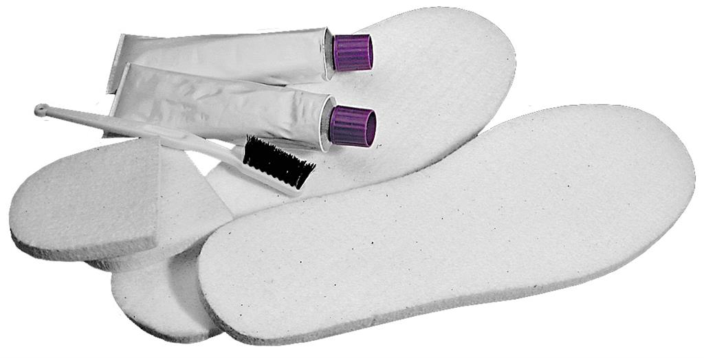 Et komplett sett som inneholder filtsåler, sandpapir og to store tuber med vanntett lim.