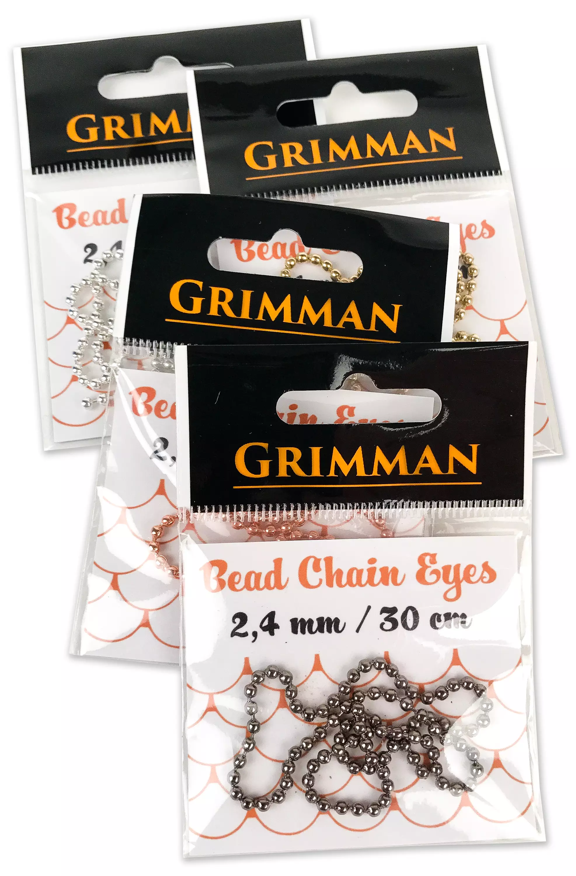 Grimman Bead Chain Eyes er Grimman sin versjon av kulekjede. Tilgjengelig i både metallfarger og i svært lyse malte fluoriserende farger. Med tre tilgjengelige størrelser kan du velge den som passer best til ditt bruk. Pakken inneholder omtrent 30 centimeter kulekjede. Materiale: messing.