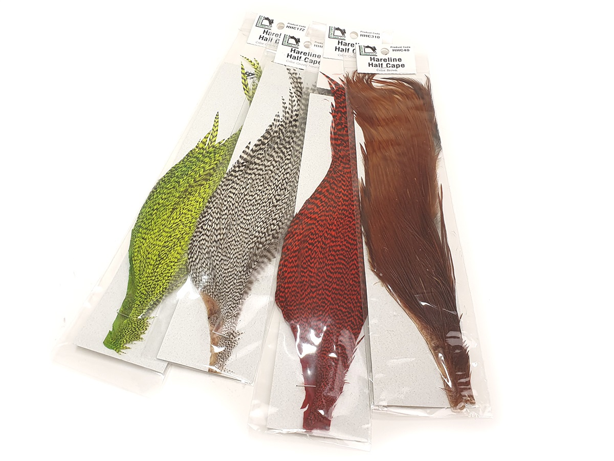 Hareline Half Rooster Cape er en halv hanehals som tilbyr allsidig materiale for fluebinding. Den er spesielt egnet for tørrfluer og streamere, som Flatwings. Halsen har et stort utvalg av fjær i forskjellige størrelser, noe som muliggjør mange bruksområder.