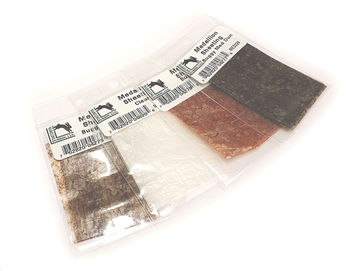 Hareline Medallion Sheeting er et utmerket materiale for realistiske vinger og vingemønstre, og det er laget for å ligne Stalcup-film. Produktets tynne film er flekkete, noe som gir et svært realistisk utseende. Materialet er enkelt å klippe fra arkene og lett å håndtere, men det er også slitesterkt, slik at fluene dine varer lenger. Filmen brukes hovedsakelig til ulike vinger på tørrfluer samt vingemønstre på nymfer og pupper, selv om innovative fluebinderne også finner andre bruksområder for det.