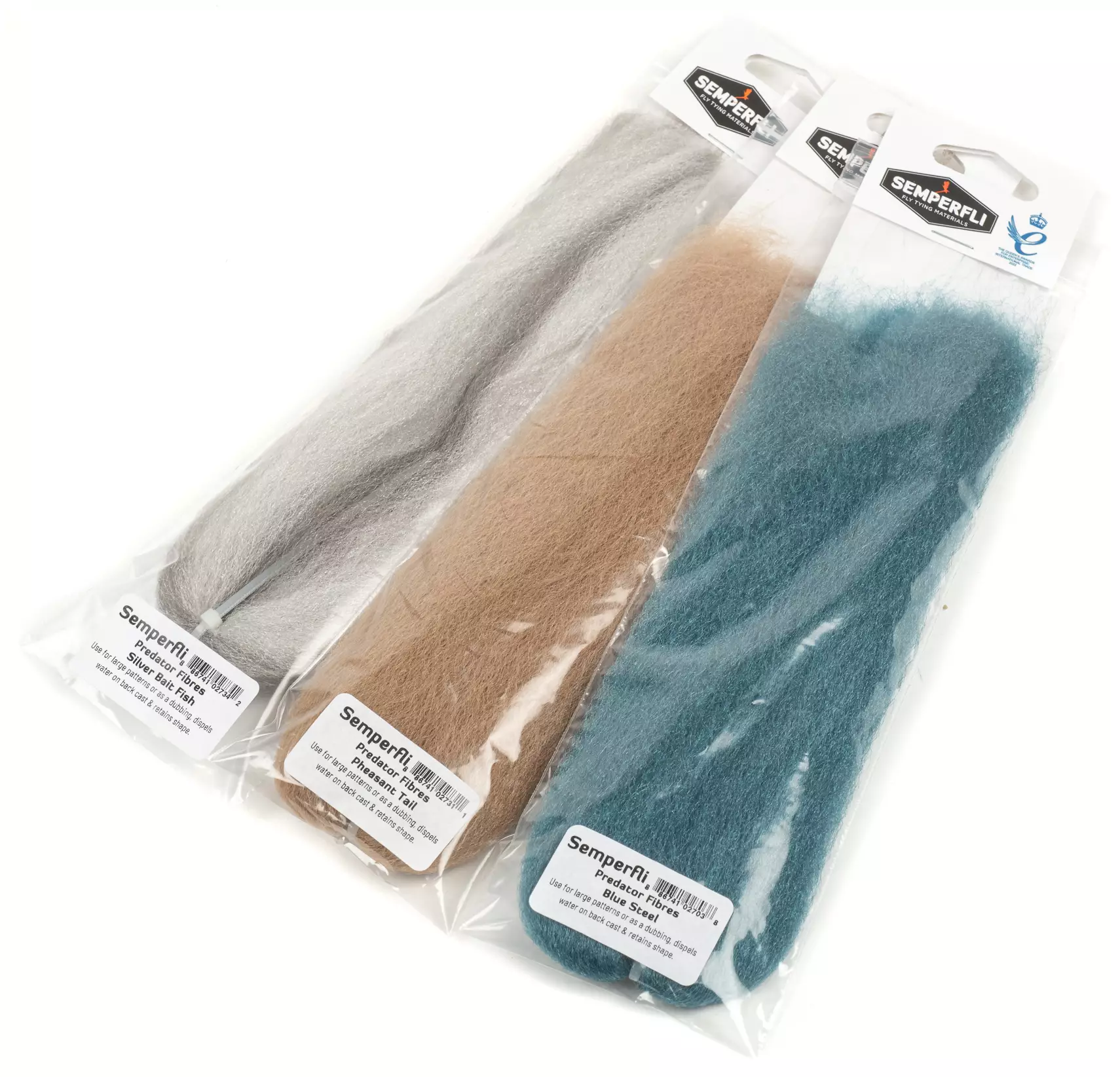 Predator Fibres fungerer også utmerket i fallskjermhackler, under vinger på tørrfluer eller til og med som dubbingmateriale for kroppen. Hver pakke inneholder 500 mm lange fibre som er brettet i to. Utvalget inkluderer også unike blandinger som gir utmerket valuta for pengene.