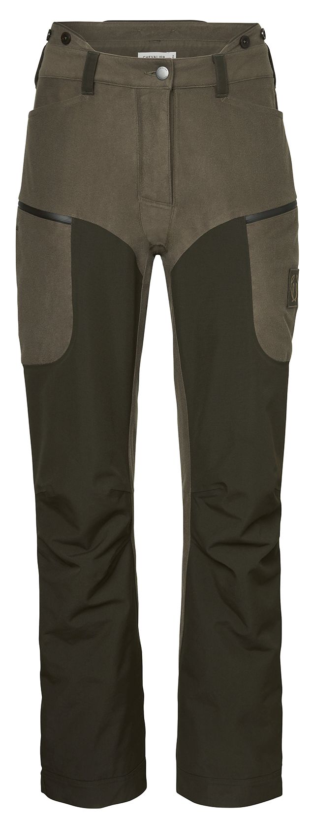 Chevalier Pointer Chevalite Pants 3.0 er lydløse og fleksible skallbukser for kvinner, laget av børstet stretchmateriale. Buksene er designet for jakt og utendørsaktiviteter. Konstruksjonen er vanntett og vindtett takket være Chevalite-membranen og teipede sømmer. Kontrastfargede forsterkninger på forsiden av lårene og nederst på bena. Pointer 3.0-buksene har en forhøyet midje som stiger komfortabelt opp på ryggen og sikrer at buksene ikke avslører huden når du setter deg ned eller klatrer i ulendt terreng. Bena har glidelåsåpninger for ventilasjon. Midjebåndet har både beltehemper og knapper for seler. Pointer 3.0-buksene har flere praktiske og nøye gjennomtenkte lommer, som fleecefôrede håndlommer og romslige lårlommer. Den høyre lårlommen har en nettinglomme for mobiltelefon, og den venstre har en elastisk patronholder. Buksene har ergonomisk passform, forhåndsbøyde knær og justerbare knær og benåpninger. På innsiden av falden er det en løkke som du kan feste buksene til skoene med for å forhindre at bena glir opp. Hovedmaterialet og fôrstoffene er laget av resirkulert polyester.
