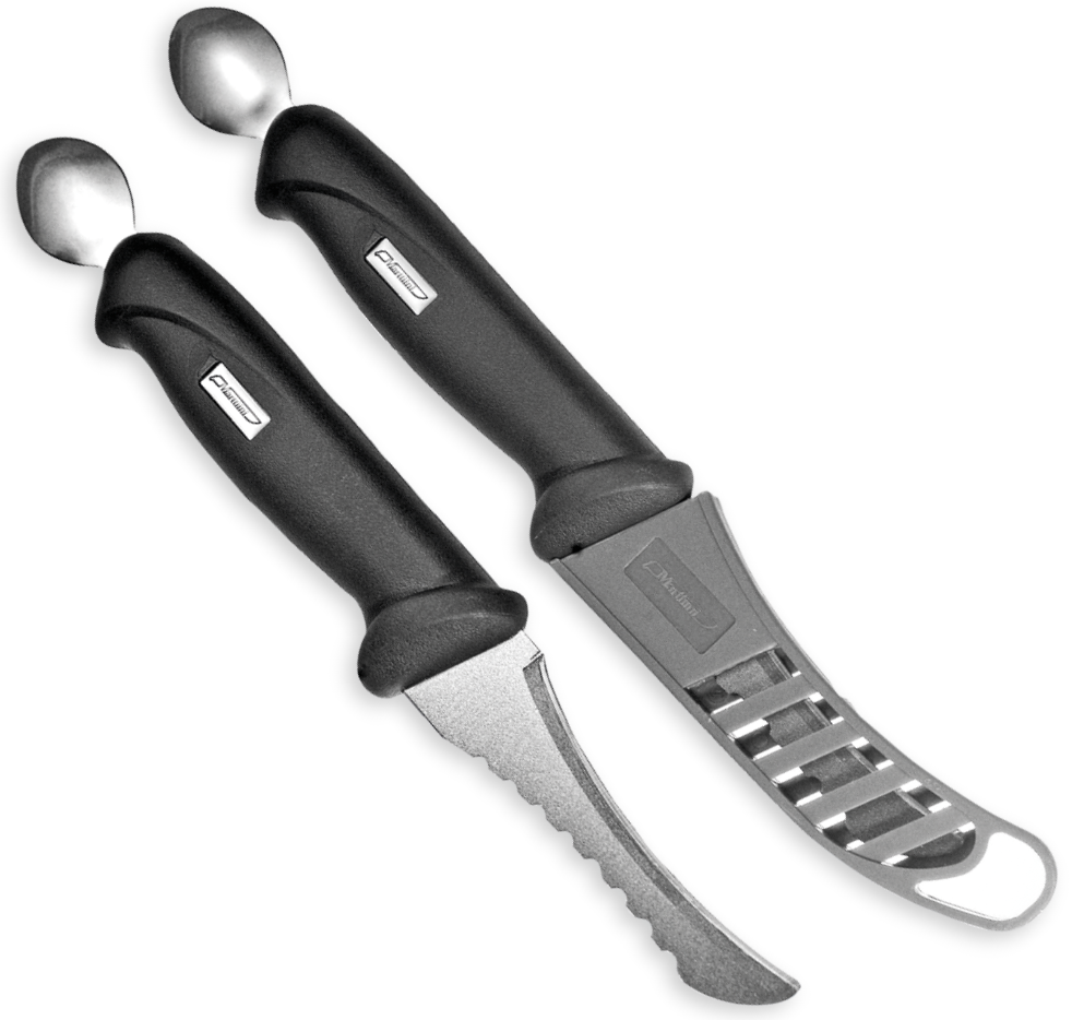 Marttiini Fish Cleaner - Fiskerenser. En mester i fiskerensing. Fiskerenseren er, som navnet tilsier, et praktisk verktøy for rensing av fisk. Med det buede bladet er det enkelt å åpne fisken, og med taggene kan du skrape skjellene effektivt. Med metallskjeen på enden av håndtaket kan du fjerne innvollene raskt og rent. Bladet beskyttes av en plastbeskyttelse.