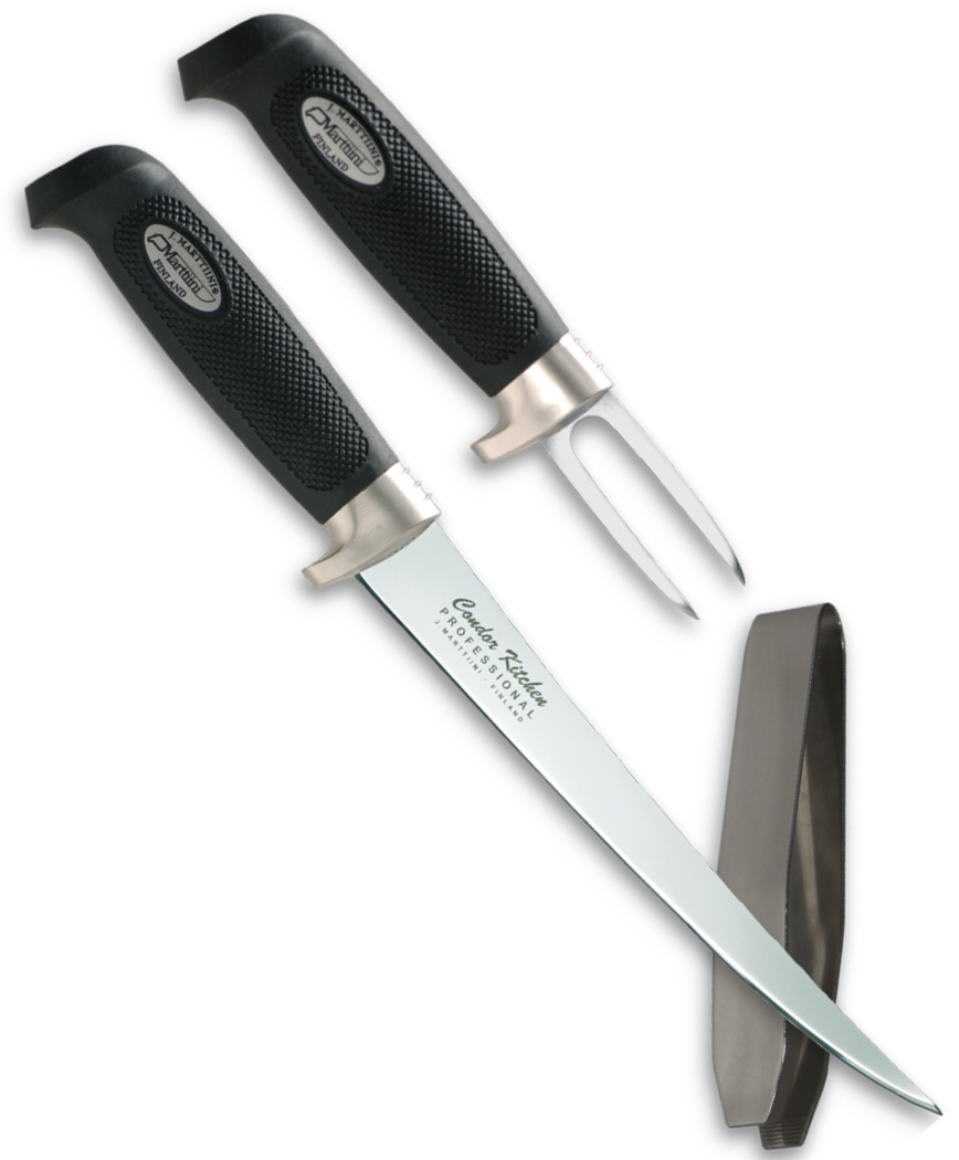 Marttiini Condor -seriens produkter med gummihåndtak er kjent for sitt høykvalitets kromstål og selvfølgelig det svært godt gripende gummihåndtaket. I tillegg har Condor-seriens kniver og verktøy fingerbeskyttelse.