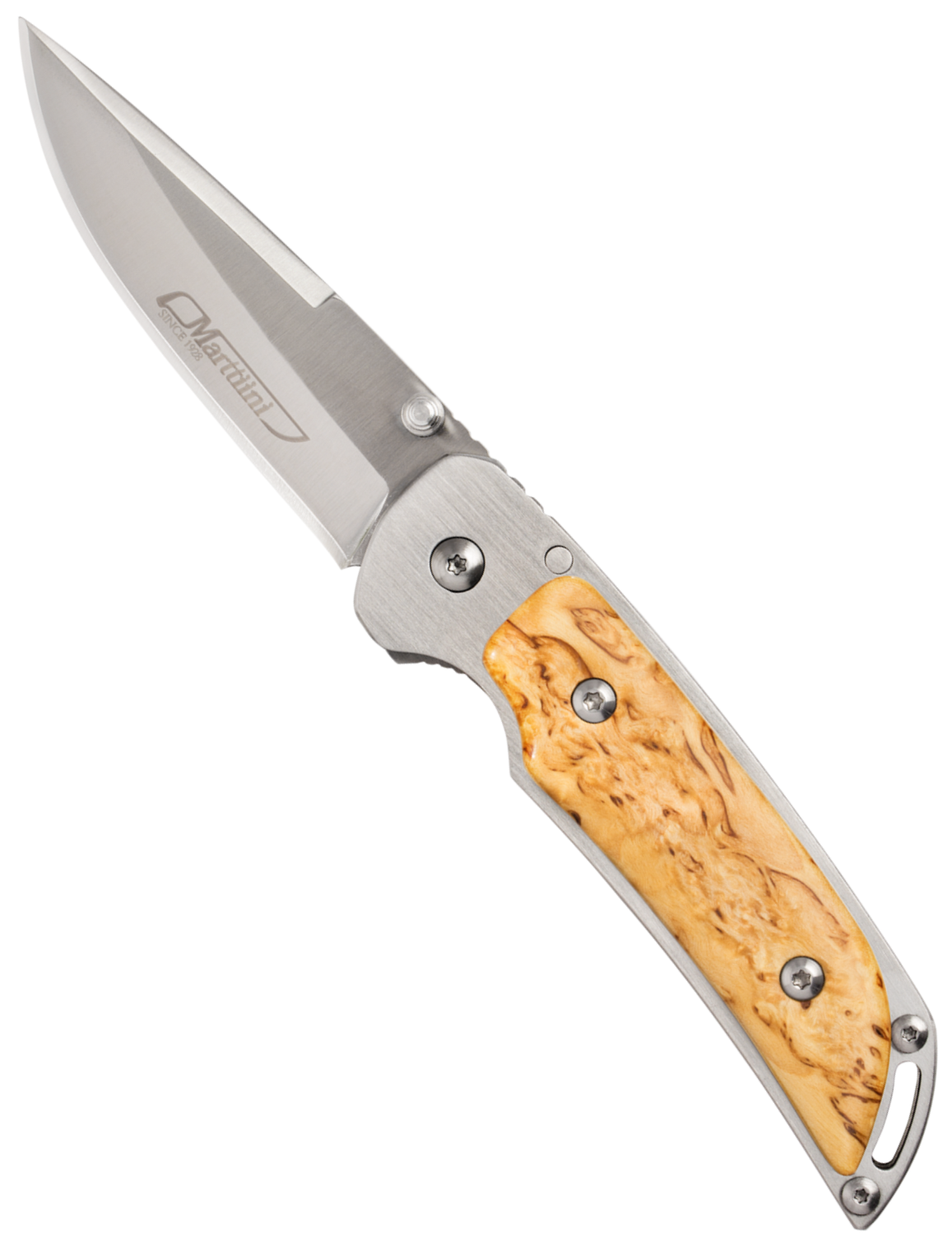 Marttiini MFK Visa Foldekniv er en allsidig foldekniv som egner seg til friluftsbruk og som et generelt verktøy. Knivens 8 cm lange blad er laget av japansk rustfritt stål og har en satinfinish, noe som sikrer holdbarhet og et elegant utseende. Håndtaket er laget av vakker masurbjørk, og det har en belteklips som gjør det enkelt å feste kniven til for eksempel et belte. Denne kniven er et utmerket valg for de vanligste spikkearbeidene, som å lage opptenningsved, og den er også egnet for fiske til å bløgge fangsten.