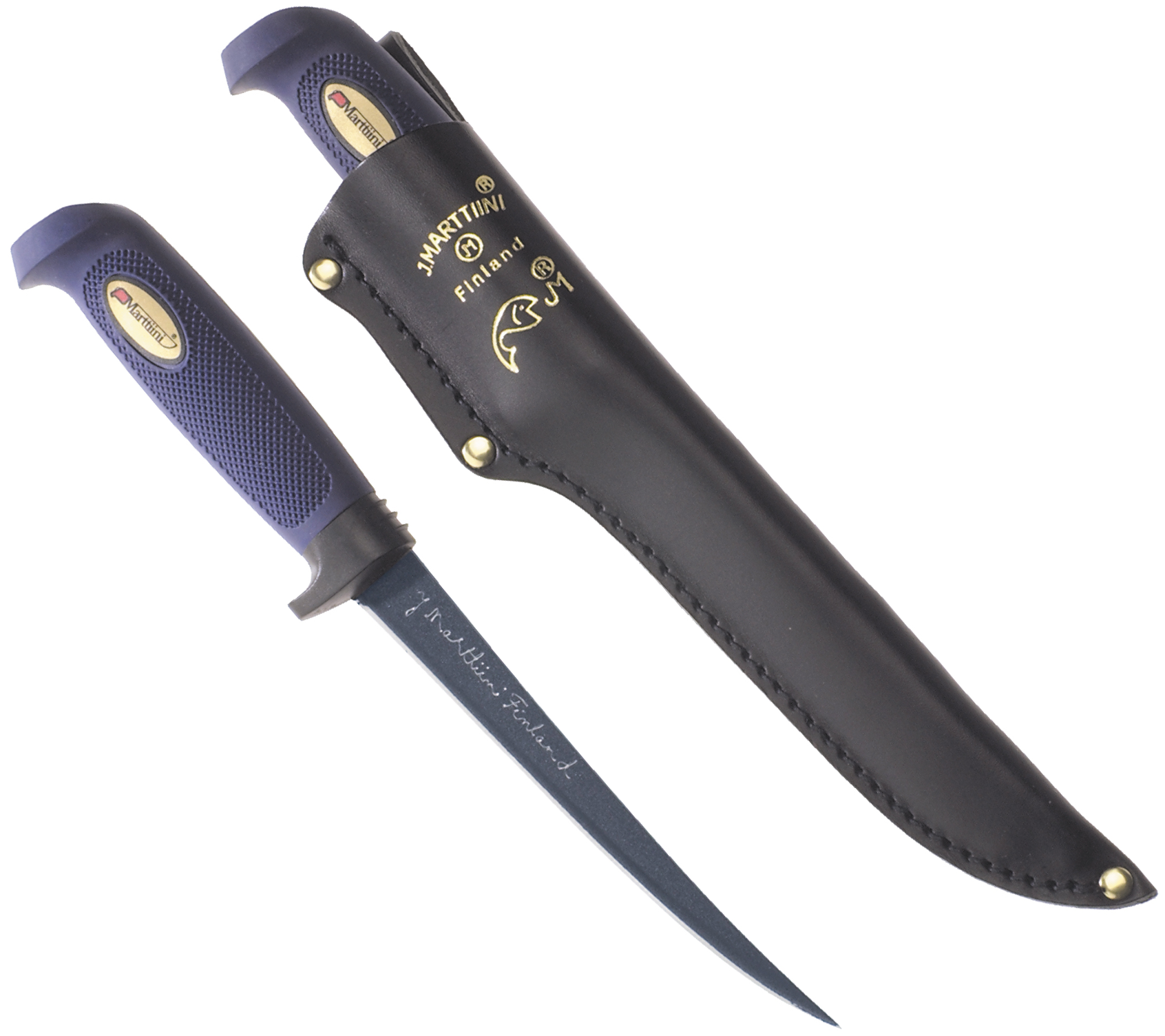 Marttiini Fileteringskniv Martef 6" -Fileteringsknivens riflede gummihåndtak og fingerbeskyttelse sikrer et godt grep under alle forhold. Bladlengden på 6" eller ca. 15 cm er best egnet for filetering av fisk som veier rundt 1 kg. Kniven er også et utmerket verktøy for mange andre kjøkkenoppgaver. Fileteringskniven leveres med en svart lærslire.