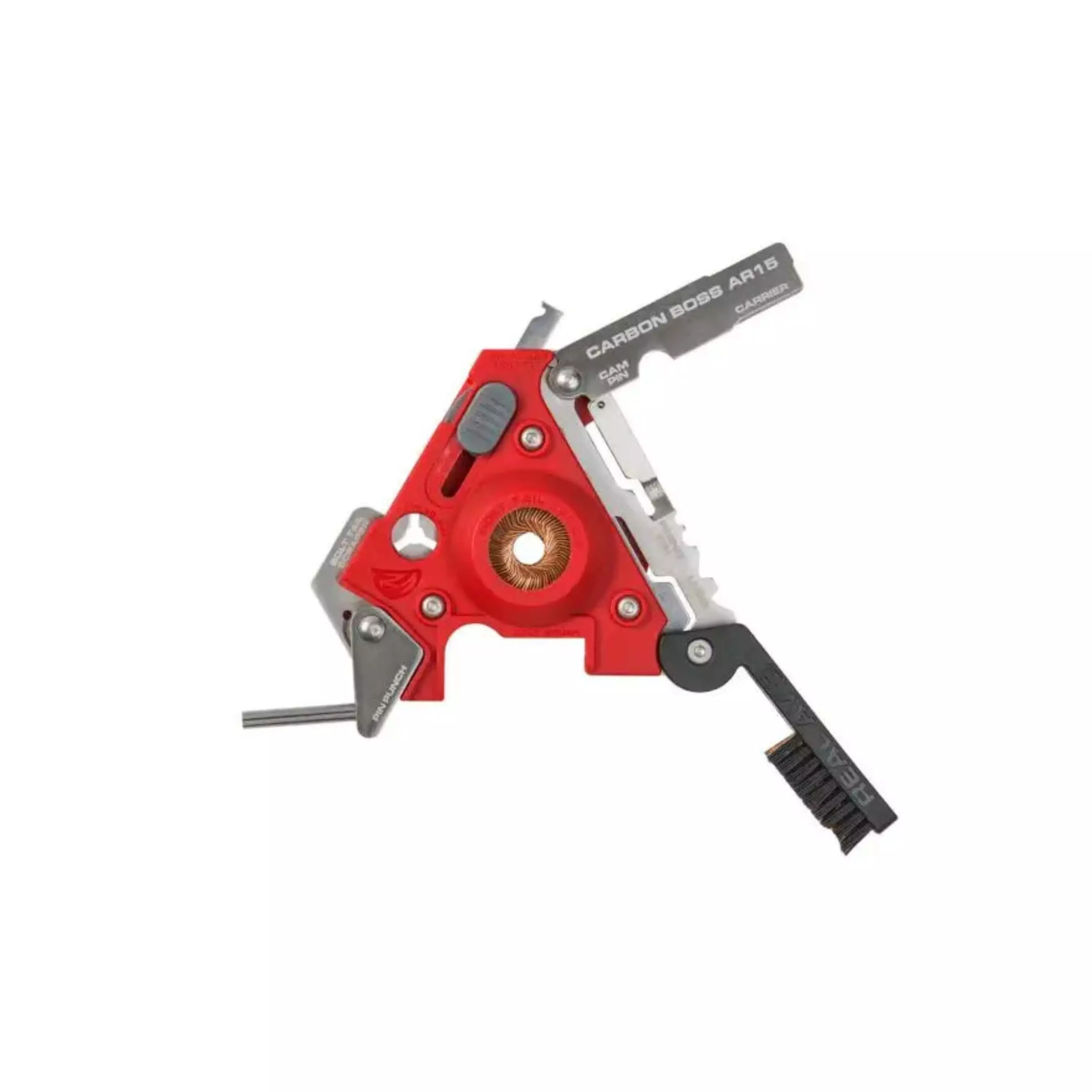 Real Avid Carbon Boss AR15 - er et multifunksjonsverktøy designet for vedlikehold av AR-15 rifler, spesielt for fjerning av karbonrester. Verktøyet samler løsninger for rengjøring av kritiske overflater på bolt, bolt carrier, cam pin og firing pin. Det har 12 presise rengjøringsflater, en cotter pin puller, en utskiftbar roterende hybrid SMART BRUSH og en integrert bolt tail finishbørste, som gjør rengjøringsarbeidet effektivt uten behov for ekstra verktøy.