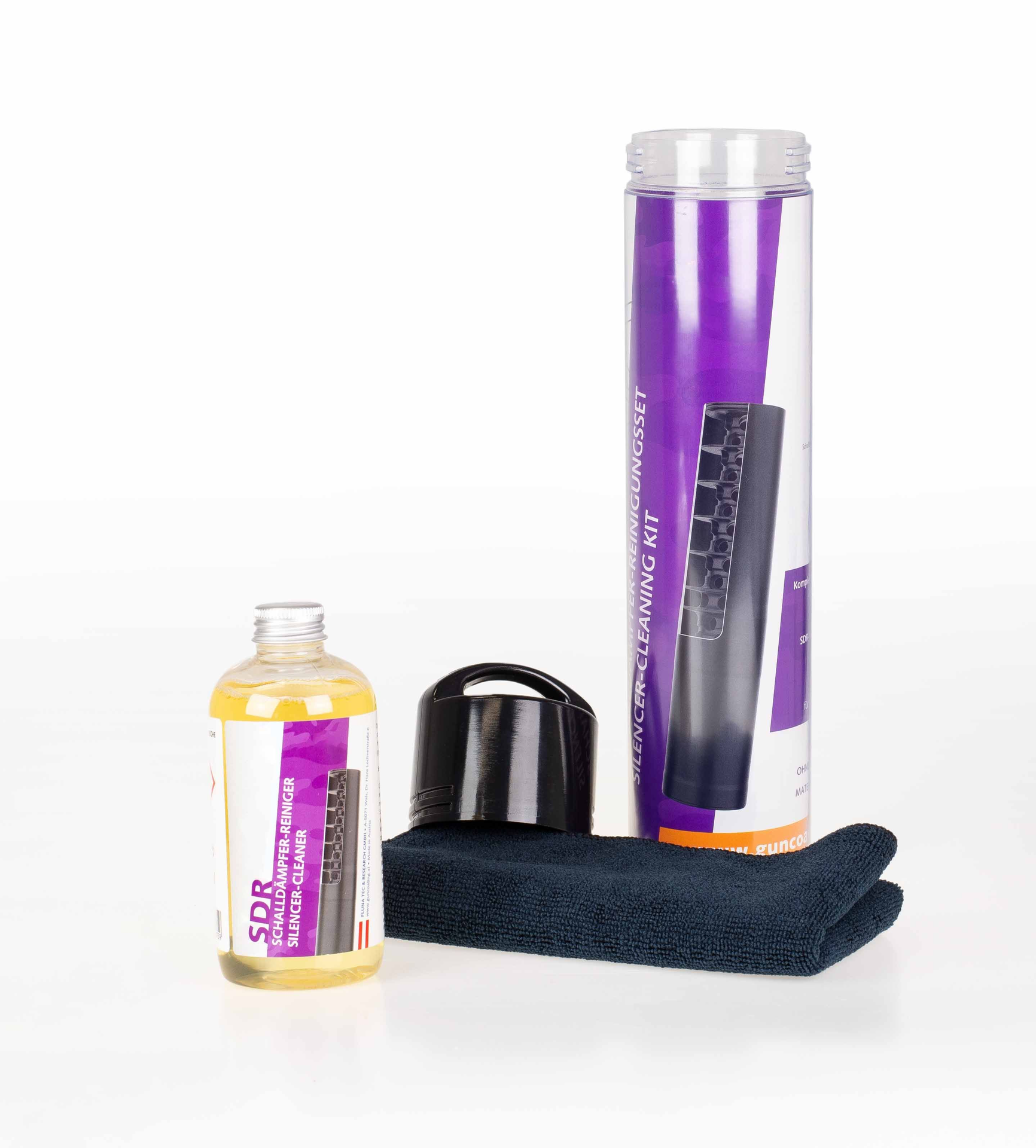 SDR Lyddemper Rengjøringssett er spesielt designet for grundig rengjøring av lyddempere. Settet inneholder en rengjøringsvæske som helles i det medfølgende transporthylsteret. Lyddemperen plasseres i hylsteret, lukkes med lokket og ristes kraftig i noen minutter. Deretter lar man rengjøringsmiddelet virke over natten. Til slutt tørkes lyddemperen og dens deler med den medfølgende mikrofiberkluten. Denne prosessen hjelper med å fjerne selv inngrodd smuss effektivt.