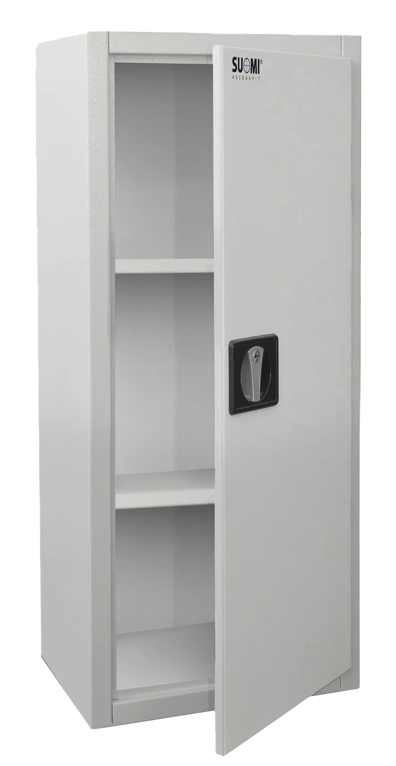 Suomi Ammo L patronkabinett er beregnet for oppbevaring av ammunisjon til skytevåpen. Den norske våpenloven krever at våpeneiere oppbevarer ammunisjon i et låsbart skap. Det låsbare Ammo L-patronkabinettet er laget av 1,5 - 2 mm stålplate og har monteringshull for å feste skapet. Festeskruer er også inkludert i leveransen. Skapet har to justerbare hyller. Overflatene er ferdigbehandlet med hvit (RAL 9010) pulverlakk.