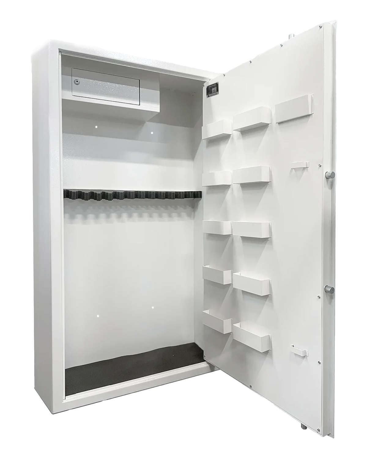 Låsbart topphylle og romslige åpne hyller (5 stk) i døren for oppbevaring av gjenstander og ammunisjon. Skapet har ferdige hull som gjør det mulig å feste skapet til gulvet eller veggen. I motsetning til bildene er den låsbare topphyllen ikke i hele skapets bredde, men omtrent 2/3 av skapets bredde: dette gir plass til to langløpede våpen på siden.