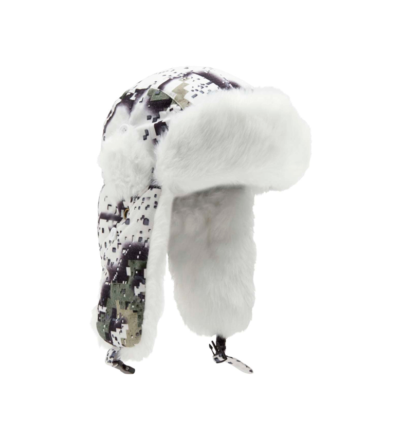 Swedteam Ridge Thermo Pilot Hat Zero Varm pilotlue foret med myk og varm kunstpels. Utsiden i hvitt Desolve Zero -kamuflasjemønster. Øreklaffene har en festestropp som kan brukes til å feste klaffene sammen under haken eller på toppen av hodet hvis man ønsker klaffene oppe. Materialet er gjennomgående polyester.
