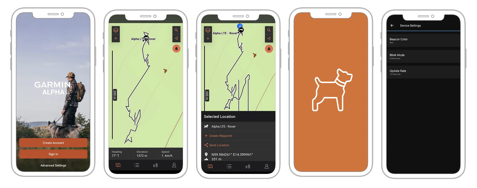 Finn hundens posisjon og spor dens bevegelser, legg til veipunkter, naviger og mange andre nyttige funksjoner for jakt med den kompatible smarttelefonens Alpha-applikasjon (krever abonnement).