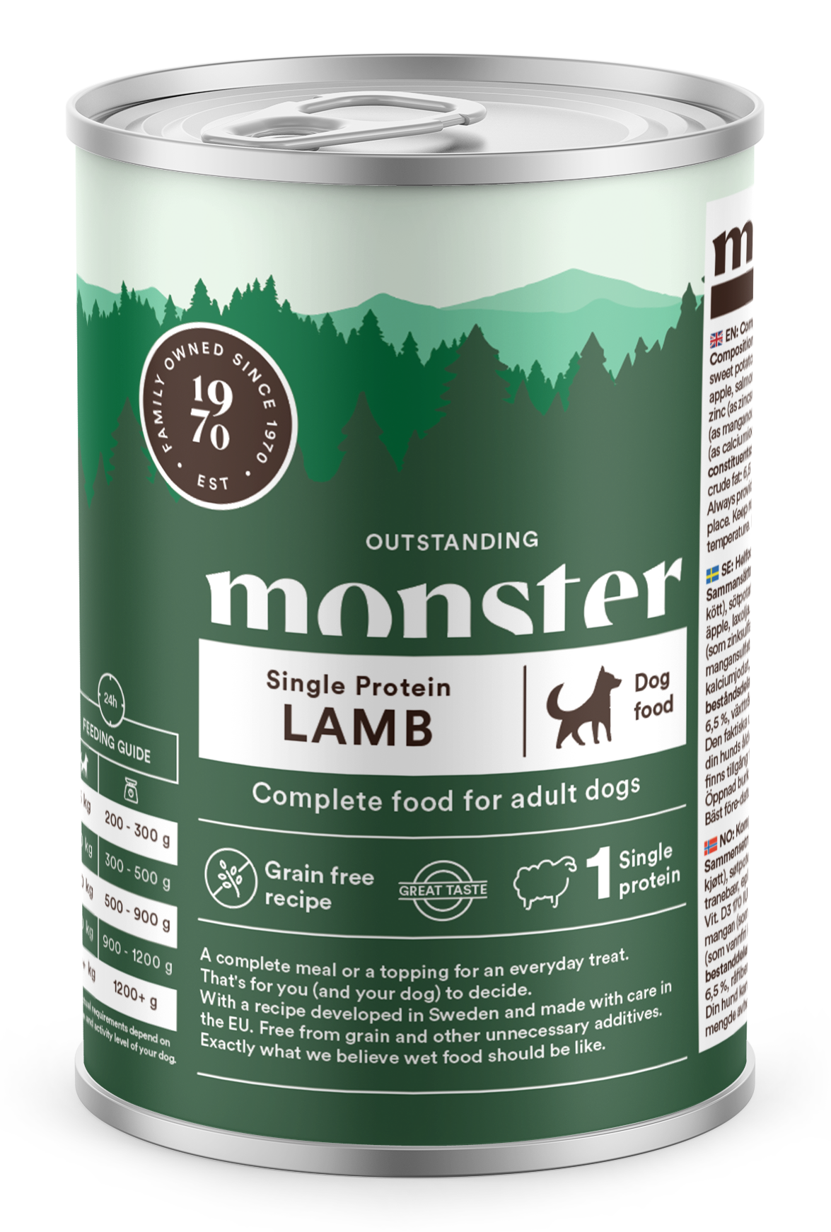 Monster Dog Adult Single Lamb 400g er en 100% kornfri hermetikk som inneholder rikelig med sunn lam. Kan brukes enten som fullfôr eller som en liten luksus i hverdagen. Produktet er utviklet i Sverige og laget av nøye utvalgte råvarer – uten unødvendige tilsetningsstoffer!