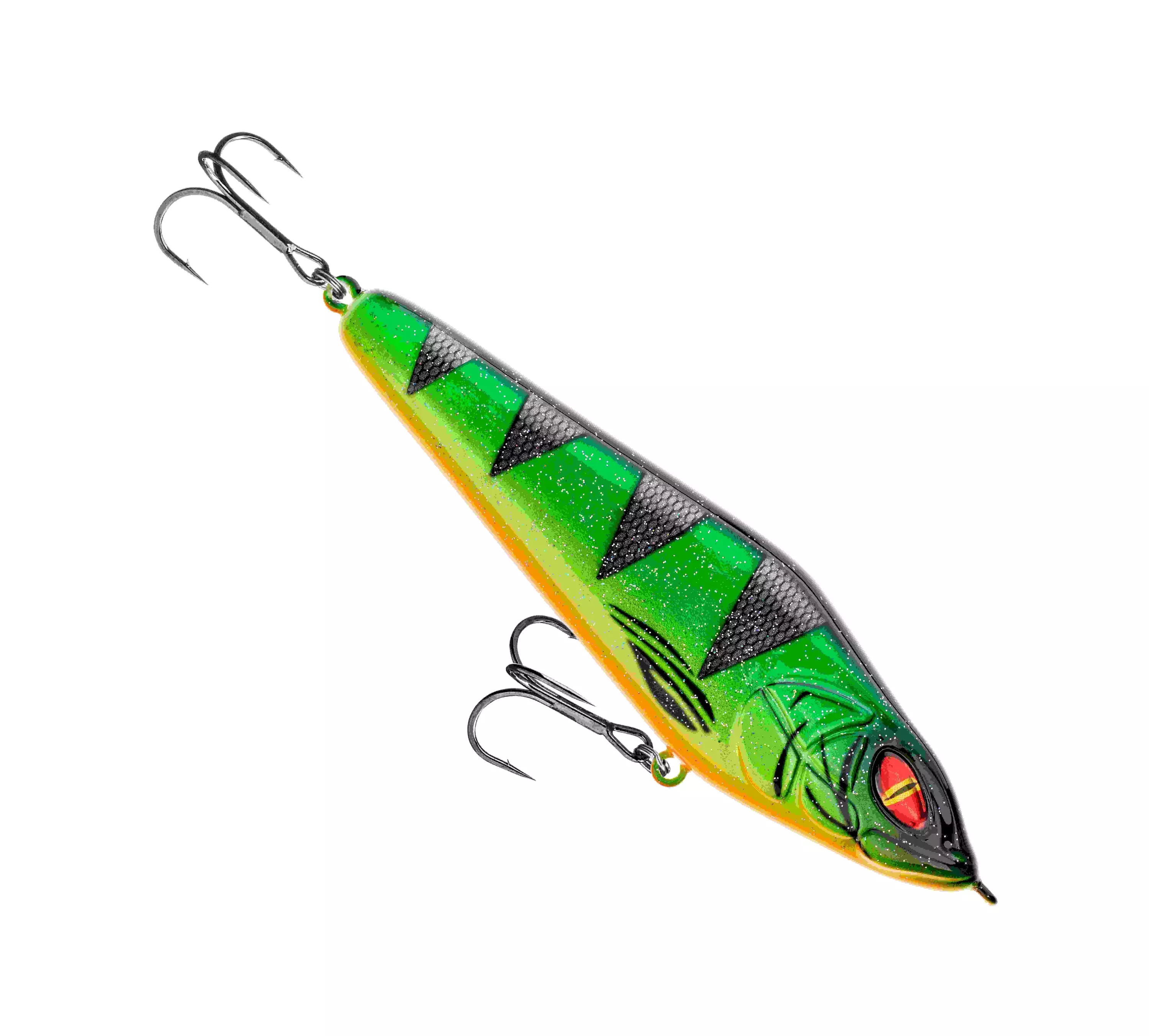 Daiwa Lazy Jerkbait kan fås til å gjøre lange sideglidninger ved å gi den fart. En utmerket allround-agn for gjeddefiske året rundt. Takket være sin strømlinjeformede design er Lazy Jerk en veldig langtkastende agn. Tilgjengelig i fire forskjellige størrelser: 9 cm, 12 cm, 15,5 cm og 17,5 cm. Hver Lazy Jerk-agn er utstyrt med skarpe, kjemisk slipte kroker.