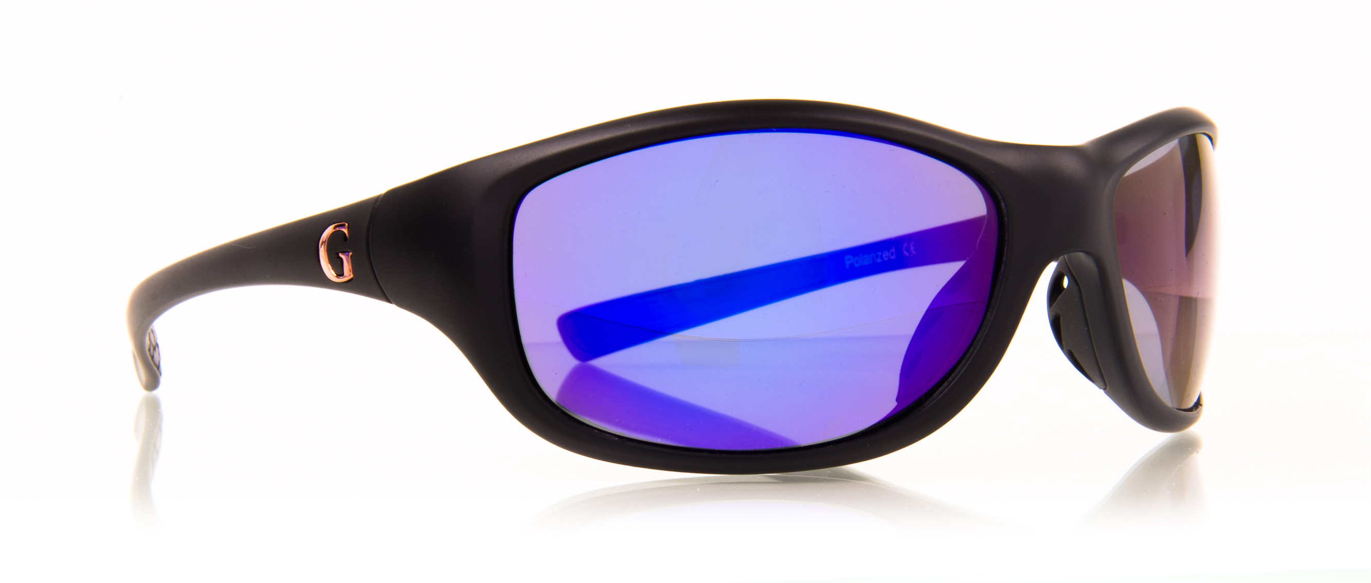 Grimman Brook Black / Blue Revo Grimman Brook solbriller har en smal profil og et design som gjør at de sitter tett på ansiktet. Dette forhindrer effektivt sollys i å trenge inn på innsiden av brillene fra sidene eller bakfra. Linsene har ripebeskyttelse og antirefleksbelegg på innsiden, noe som forbedrer komforten ved bruk.