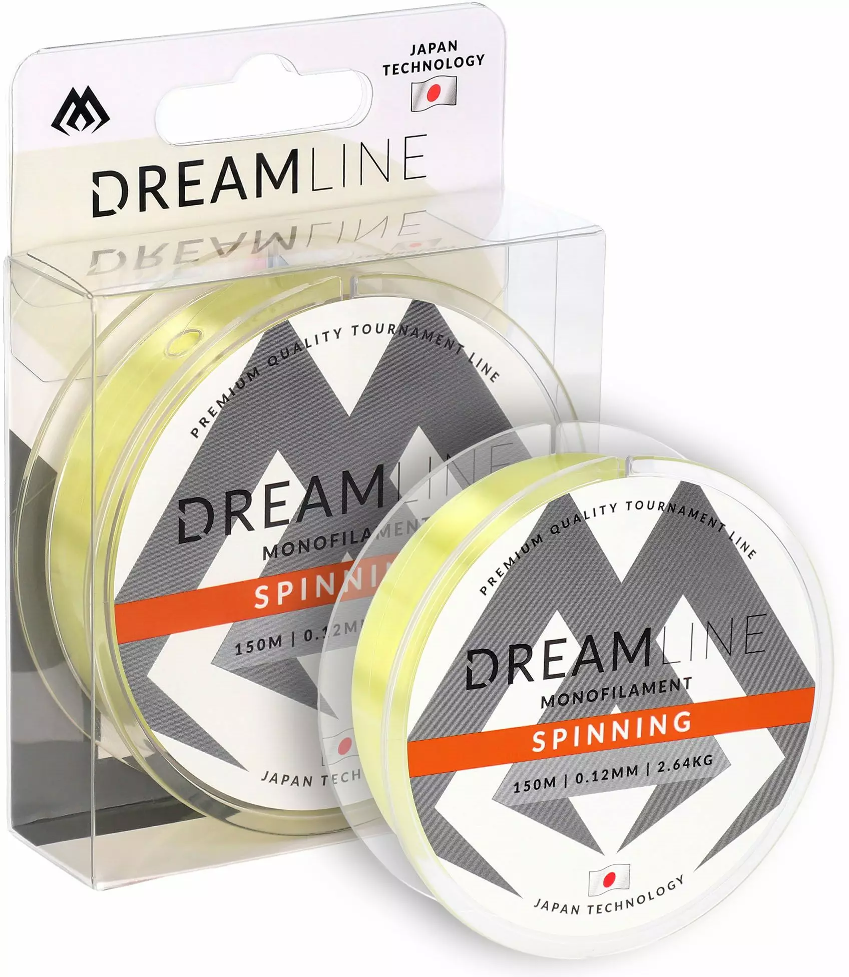Mikado Dreamline Yellow gul monofilamentline, levert på en 150-meters spole. Linen er myk og fleksibel, og den er spesielt egnet for isfiske og elvefiske.
