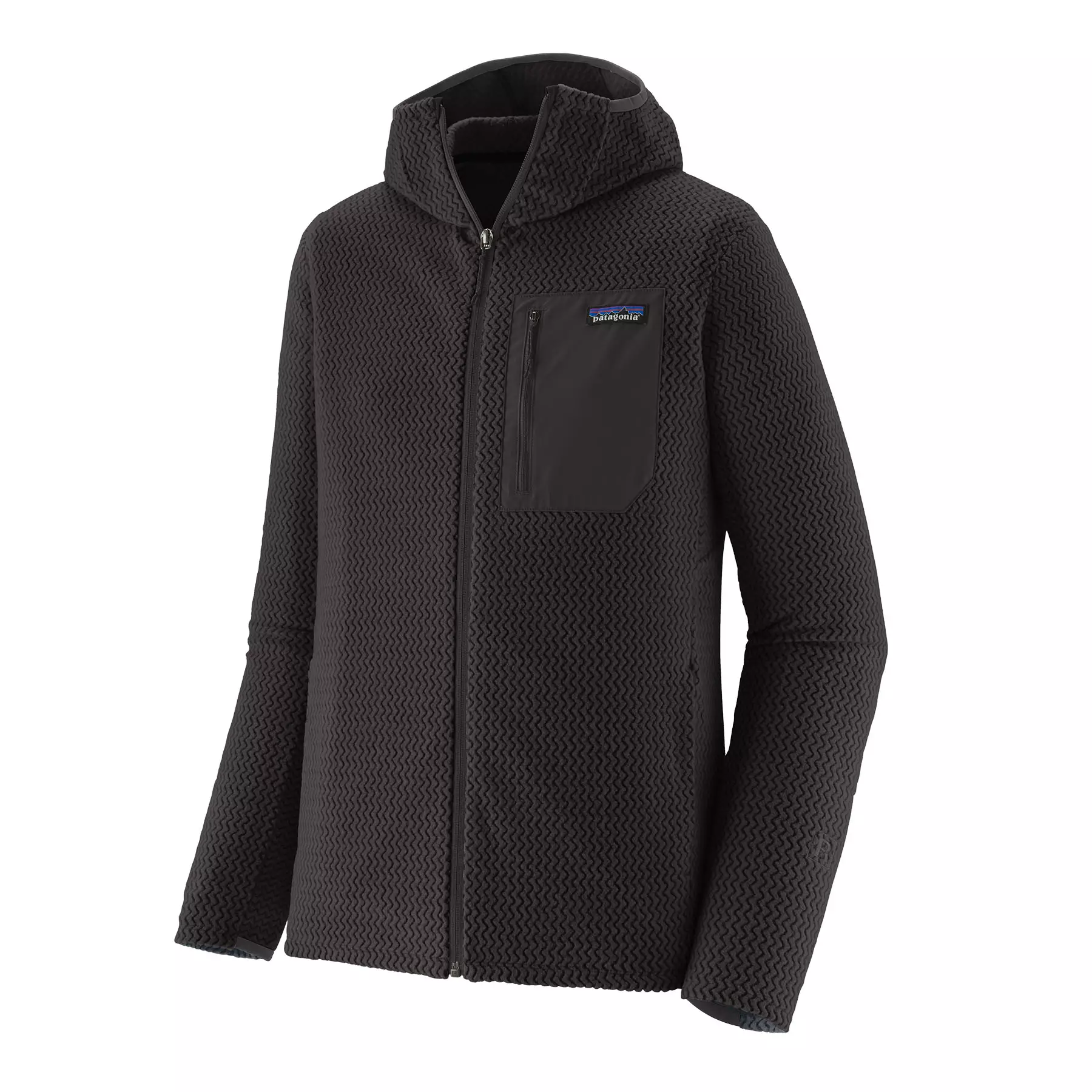 Patagonia Mens R1 Air Full-Zip Hoody Black Patagonia R1 Air er en lett, pustende og hurtigtørkende teknisk fleecehettejakke laget av 100 % resirkulert polyester. Den er designet for kjølige forhold og aktiv bevegelse.