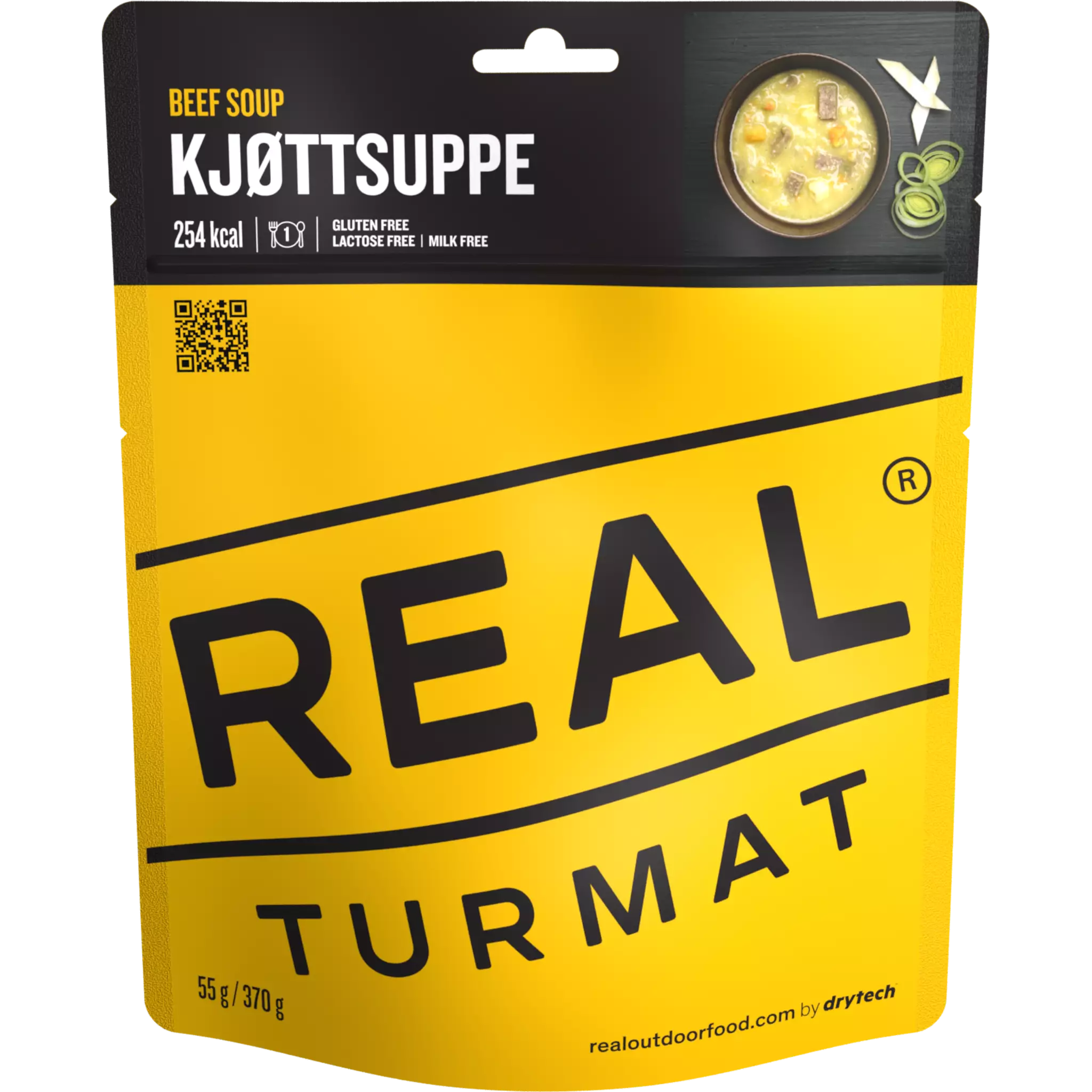 Real Turmat Beef Soup er et praktisk frysetørket turmåltid der enkel tilberedning, god holdbarhet og praktisk pakking står sentralt. Smaksbildet bygger på Klassiker med storfekjøtt og rotgrønnsaker, noe som gjør produktet godt egnet når du ønsker et raskt, men fortsatt mettende alternativ. Den tørkede strukturen gjør produktet lett å bære med seg, og den ferdige porsjonen passer godt til vandring, jakt, hytta og beredskapsmat.
