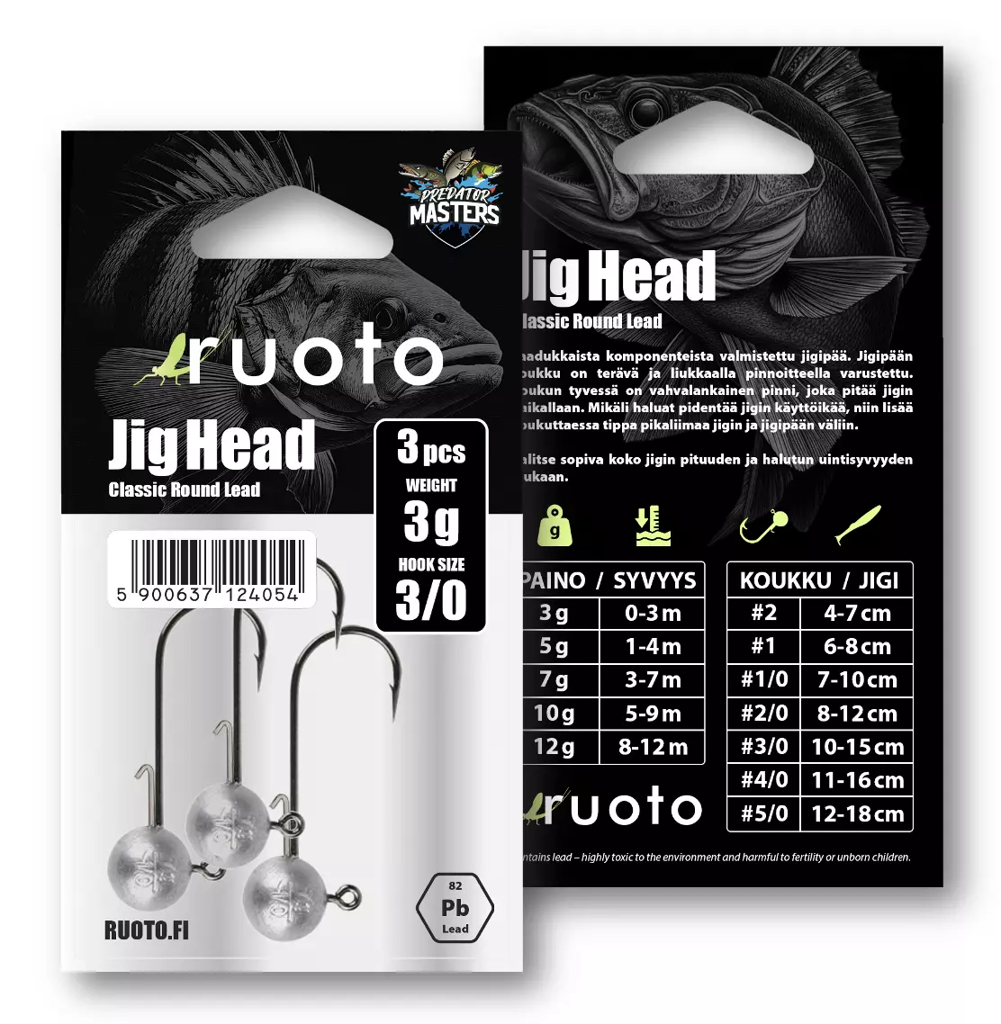 Ruoto PredatorMasters Classic Round Lead er et tradisjonelt rundt jigghode laget av kvalitetskomponenter. Disse jigghodene bruker en høykvalitets BKK-krok som er skarp og har en glatt overflate. Ved krokens base er det en sterk trådspenne som holder jiggen godt på plass. Hvis du vil forlenge jiggens levetid, legg til en dråpe superlim mellom jiggen og jigghodet når du fester den.