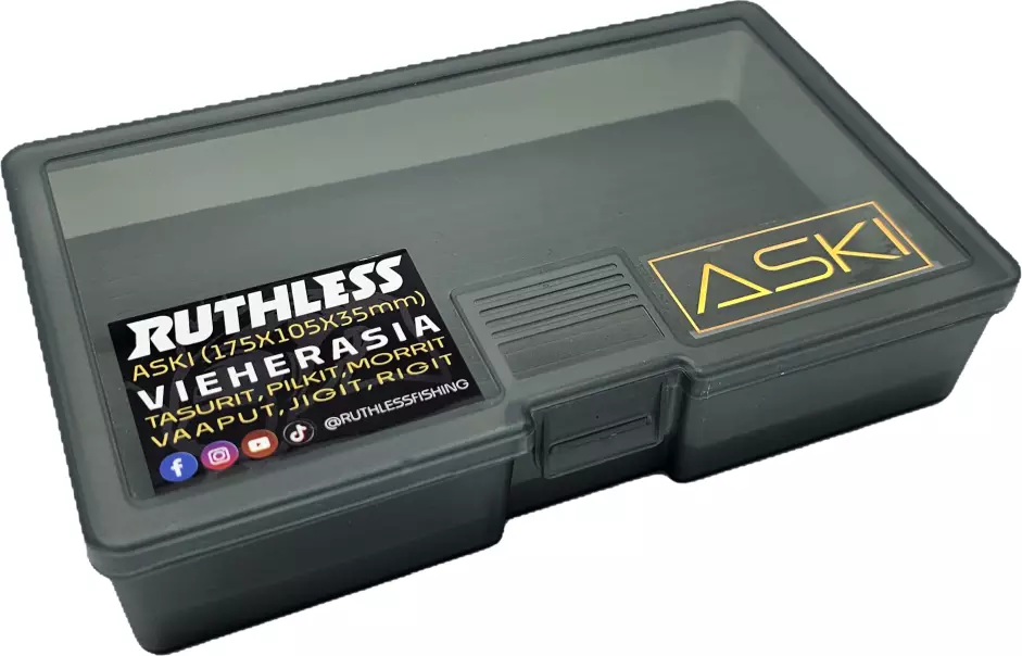 Ruthless Aski Slukboks er en kompakt og praktisk slukboks som enkelt kan tas med av fiskeren, for eksempel i jakkelommen. Boksen er designet for oppbevaring av ulike typer sluker, som balansepilker, vertikalpilker, jigger og rigger. Sporene i den slitesterke skumgummien som er limt til bunnen av boksen, holder slukene sikkert på plass og forhindrer skade under transport.