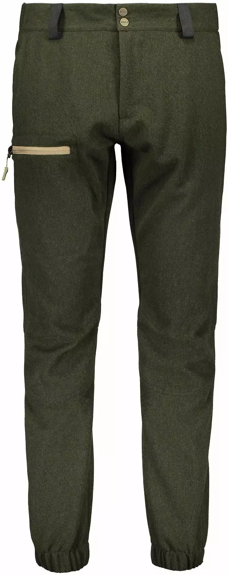 Sasta Tuohi Trousers Dark Olive lette og komfortable friluftsbukser laget av resirkulert vadmel (65% ull, 30% polyester, 5% andre fibre).