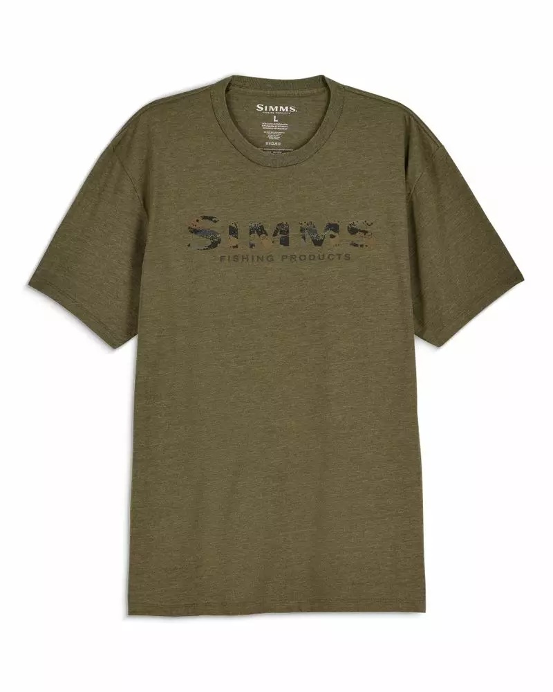 Simms Shroud Fill Logo T-Shirt Military Heather – Denne t-skjorten er designet for avslappet bruk, reise og fritid. Den tilbyr komfort og stil kombinert med Simms' gjenkjennelige utseende.