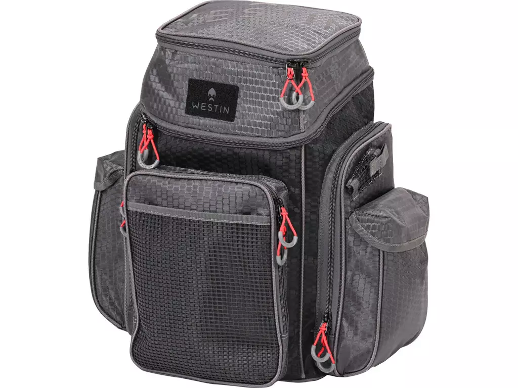 W4 BACKPACK PLUS 2 BOXES LARGE TITANIUM BLACK er en ryggsekk designet for fiskere, spesielt for oppbevaring av sluker. Sekken inkluderer to av Westins egne bokser, med dimensjonene 36x22,5x4,5 cm. Sekken er laget av polyester, belagt med et vannavstøtende materiale, som gjør den holdbar og egnet for utendørs bruk.