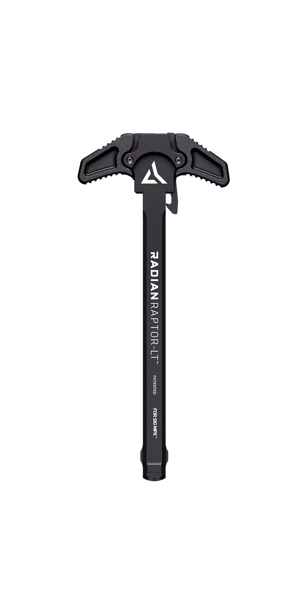 Radian Raptor-LT Charging Handle MPX, Black - tosidig ladehåndtak for SIG MPX-plattformen, som forbedrer ergonomi og pålitelighet sammenlignet med fabrikkversjonene. Den ambidekstrale designen muliggjør rask lading med håndflategrep eller tommel-pekefinger-grep fra både sterk og støttende hånd, noe som gir en jevn og rask bevegelse fra begge sider. Standard farge er svart, men den er også tilgjengelig i Flat Dark Earth og grå.
